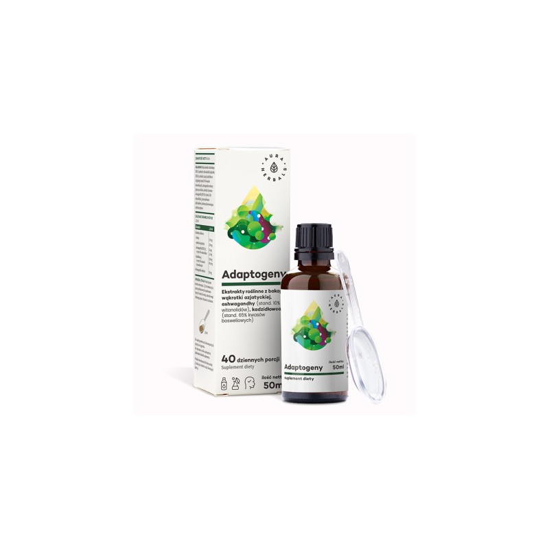 Adaptogeny - 100% naturalne ekstrakty roślinne (ashwagandha, bakopa, gotu kola, kadzidłowiec) płyn 50 ml Aura Herbals