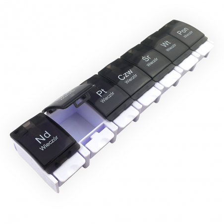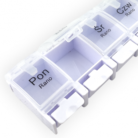 Podział na 7 dni w tygodniu: Pudełko zostało zaprojektowane z myślą o pełnym tygodniowym cyklu. Dzięki 7 osobnym przegródkom możesz łatwo przygotować i zorganizować leki na każdy dzień, co eliminuje ryzyko pomieszania dawek.