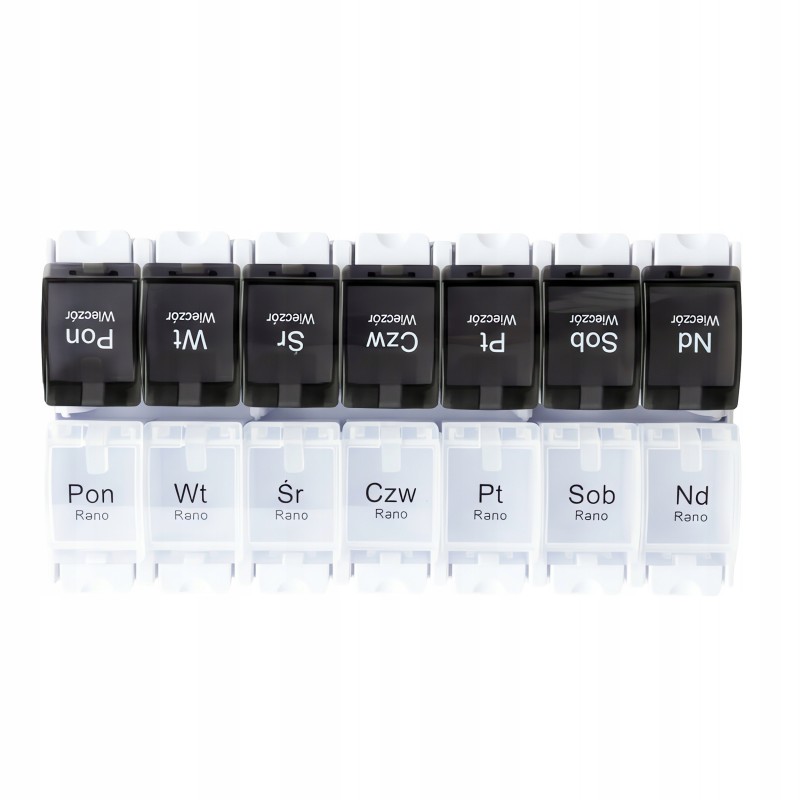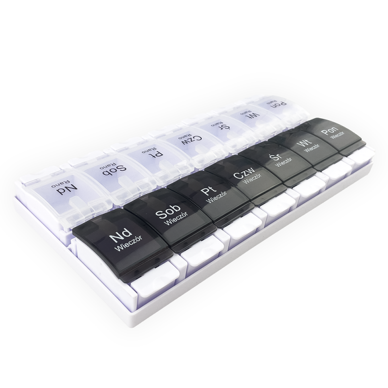 Pojemnik składa się z 14 niezależnych przegródek – po dwie na każdy dzień tygodnia, co umożliwia oddzielenie dawek leków przeznaczonych do zażycia w porze porannej od tych na wieczór. Każda przegródka jest wyraźnie oznaczona, co minimalizuje ryzyko pominięcia lub pomylenia dawek leków. Wykonany z wysokiej jakości, trwałych materiałów pojemnik jest bezpieczny i łatwy w utrzymaniu czystości. Jego kompaktowy rozmiar sprawia, że jest on bardzo praktyczny zarówno w domu, jak i w podróży, gwarantując, że Twoje leki zawsze będą uporządkowane i pod ręką.
