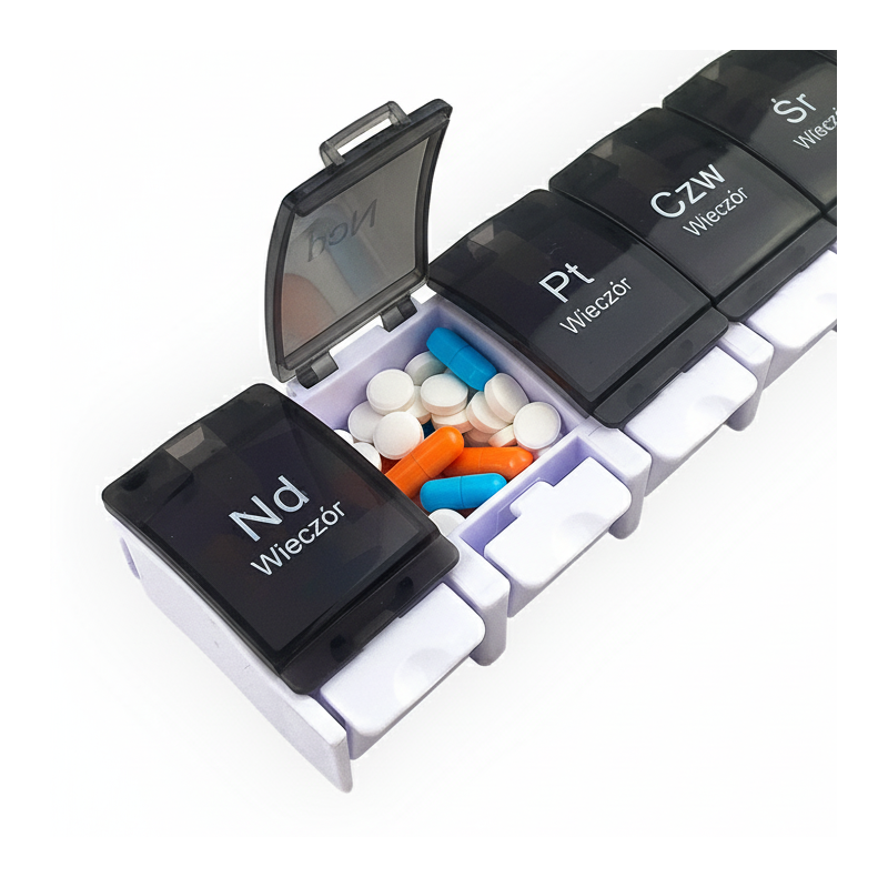 Nasze pudełko, organizer to nie tylko praktyczne narzędzie, ale również wsparcie w utrzymaniu zdrowego trybu życia. Zrezygnuj z chaosu i niepewności w przyjmowaniu leków. Pozwól sobie na spokojne skupienie się na zdrowiu.
