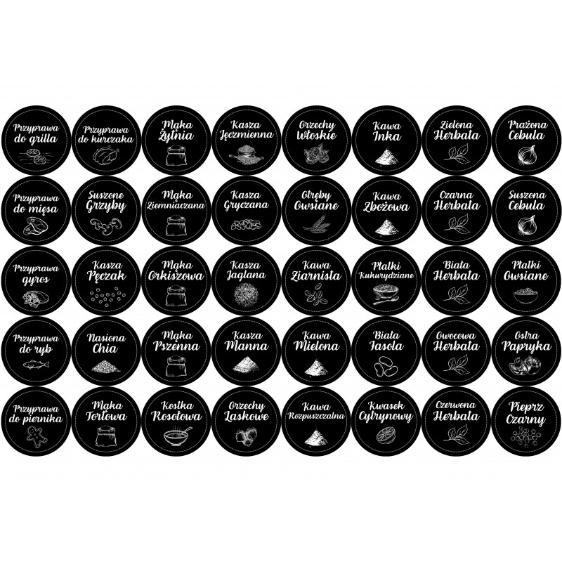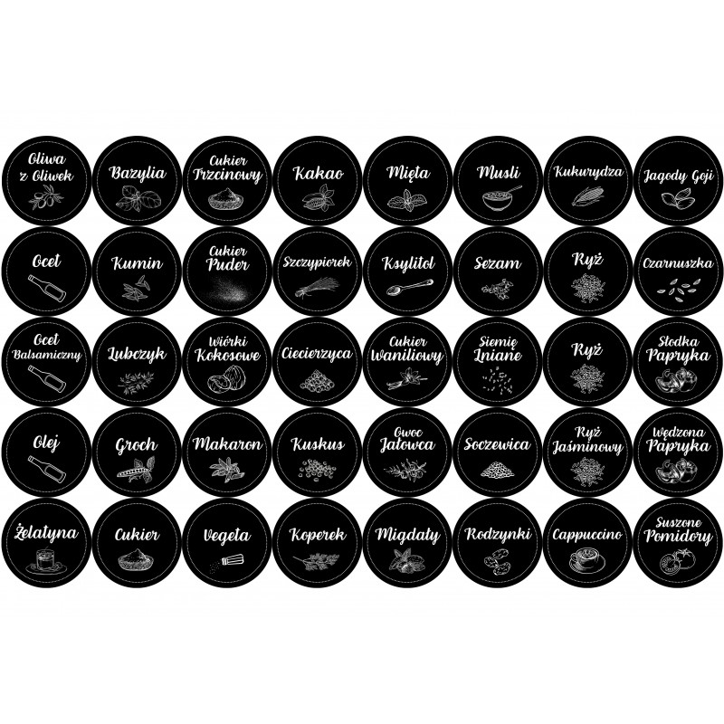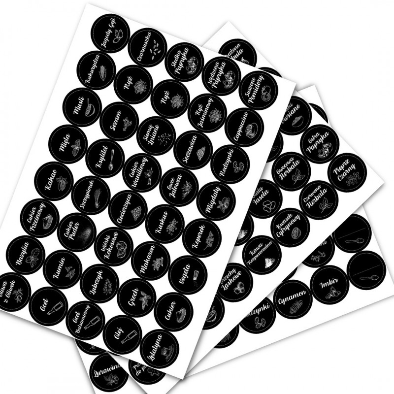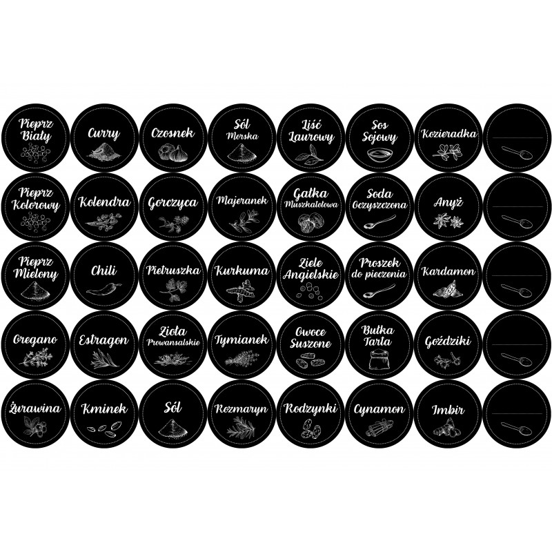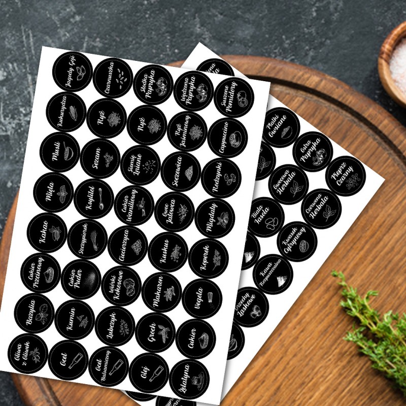 ✅ Naklejki obejmują najpopularniejsze przyprawy, między innymi sól, pieprz, rozmaite zioła, paprykę słodką, ostrą i wędzoną, suszone pomidory, goździki, czosnek, curry oraz wiele, wiele więcej!
