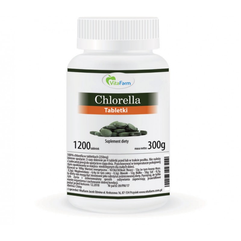 Składniki: 99% chlorella, z rozerwaną ścianą komórkową, w tabletkach (250 mg), 1% dwutlenek krzemu