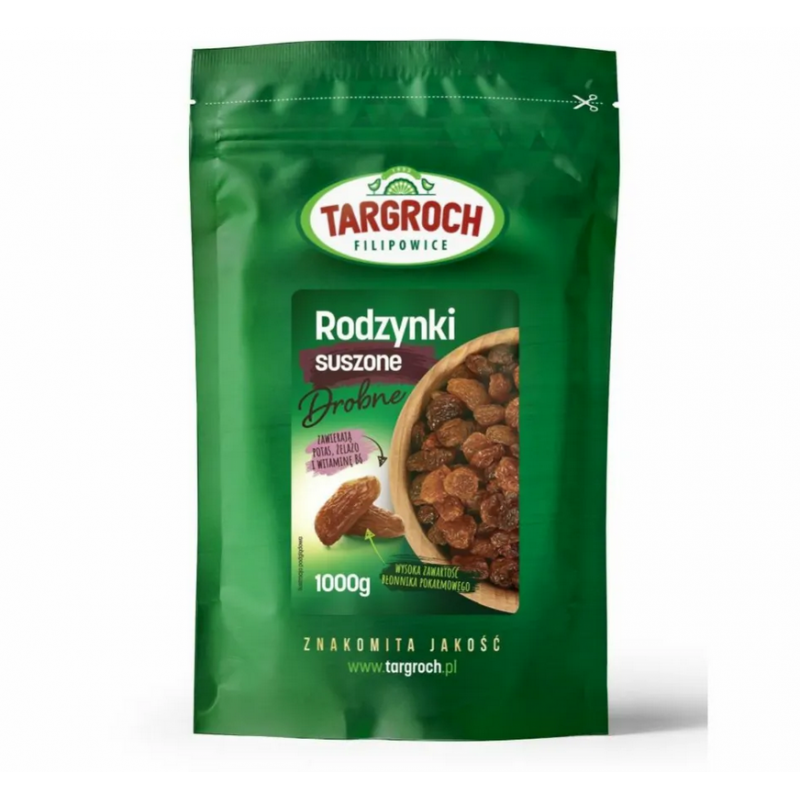 Opakowanie zawiera 1 kg rodzynek – to praktyczna ilość, która wystarczy na dłużej, zarówno do codziennego spożycia, jak i do wykorzystania w kuchni. Producentem jest firma Targroch, znana z szerokiego asortymentu zdrowej i naturalnej żywności.