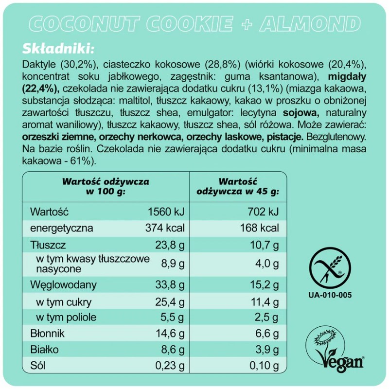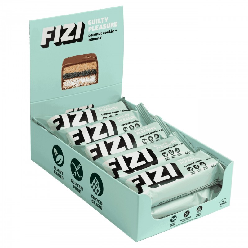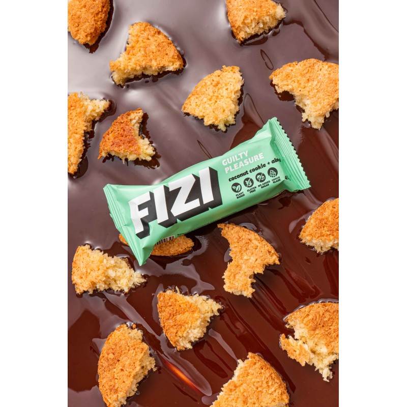 Fizi coconut cookie + almond to wegański baton premium z linii Guilty Pleasure, który udowadnia, że zdrowa przekąska może być jednocześnie wyrafinowana i pełna smaku. Połączenie aromatycznych wiórków kokosowych, delikatnej nuty migdałów i intensywnej czekoladowej polewy tworzy kompozycję idealną zarówno dla podniebienia, jak i dla ciała. Receptura została stworzona bez kompromisów – bez białego cukru, glutenu i laktozy.