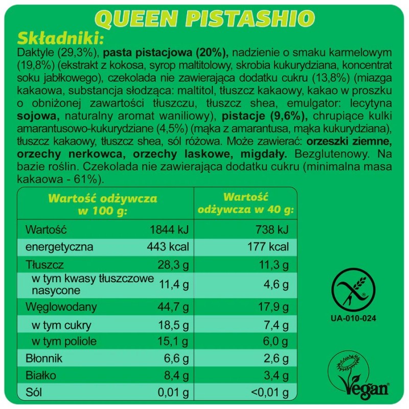Poznaj królową wśród batonów - Queen Pistachio to wyjątkowe połączenie aksamitnej pasty pistacjowej, delikatnej czekoladowej polewy i chrupiących kulek amarantusowo-kukurydzianych. Każdy kęs to harmonia smaku, która zachwyci nawet najbardziej wymagających miłośników pistacji.