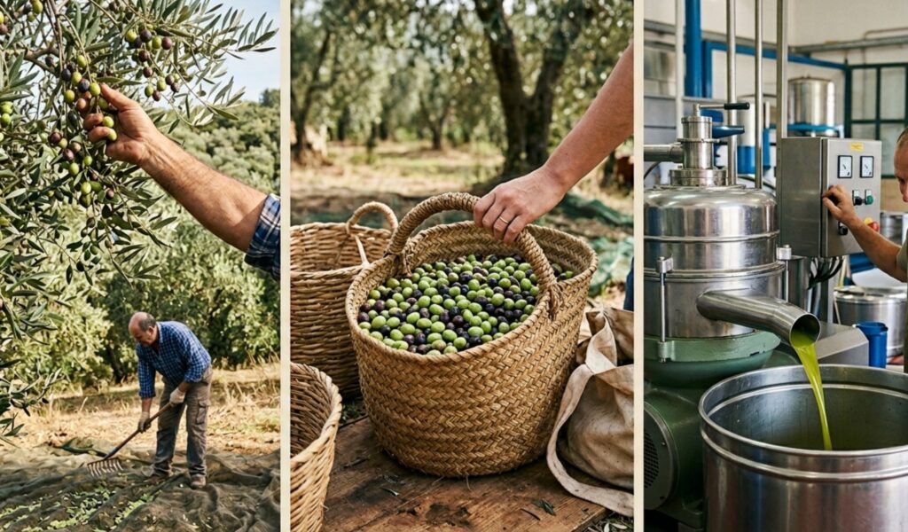 Produkcja oliwy z oliwek zaczyna się od zbioru owoców drzewa oliwnego. Oliwka musi być świeża, nieuszkodzona i odpowiednio dojrzała. Kluczowe jest to, aby od momentu zbioru do tłoczenia minęło jak najmniej czasu – najlepiej mniej niż 24 godziny.