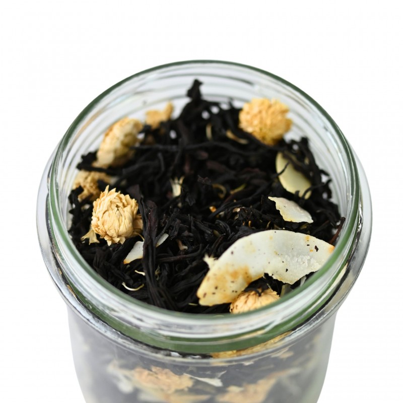 Skład: czarna herbata liściasta, wiórki i płatki kokosowe, płatki migdałowe, kwiat rumianku, płatki śniegu cukrowe, pączki róży, bławatek, aromaty