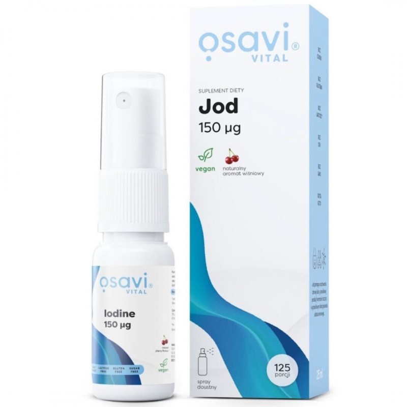 OSAVI Jod Spray Doustny 150 µg (Wiśnia) to suplement diety w formie praktycznego sprayu doustnego. Każde psiknięcie dostarcza 150 µg jodu w postaci jodku potasu - dokładnie tyle, ile wynosi dzienne zapotrzebowanie.