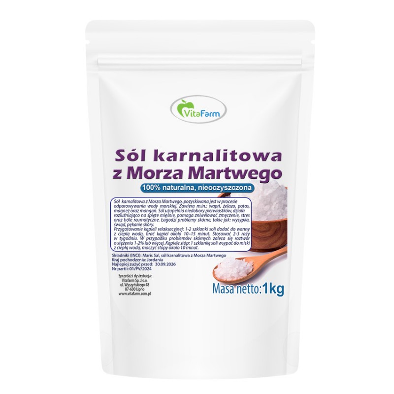 Sól karnalitowa z Morza Martwego jest naturalnym produktem, wolnym od sztucznych barwników, zapachów czy konserwantów, co czyni ją odpowiednią dla osób o wrażliwej skórze i alergiach.