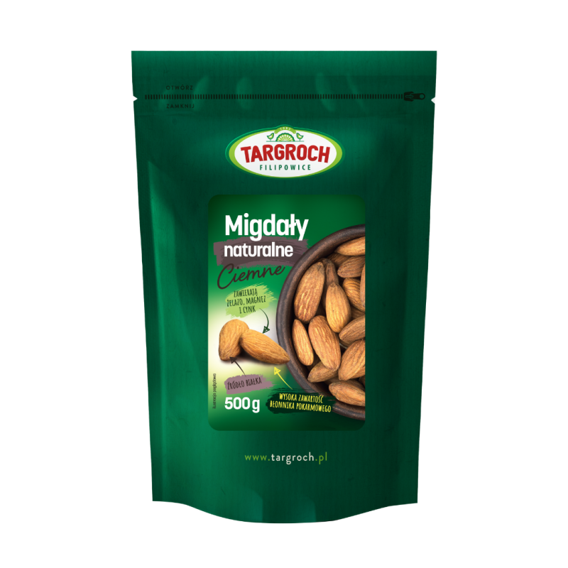 Naturalne migdały są także źródłem wielu cennych składników odżywczych – zawierają zdrowe tłuszcze, witaminy z grupy B, witaminę E oraz duże ilości błonnika pokarmowego, który wspiera prawidłowe trawienie i daje uczucie sytości na dłużej. To idealna przekąska między posiłkami – pożywna, smaczna i wspierająca zdrowy styl życia.