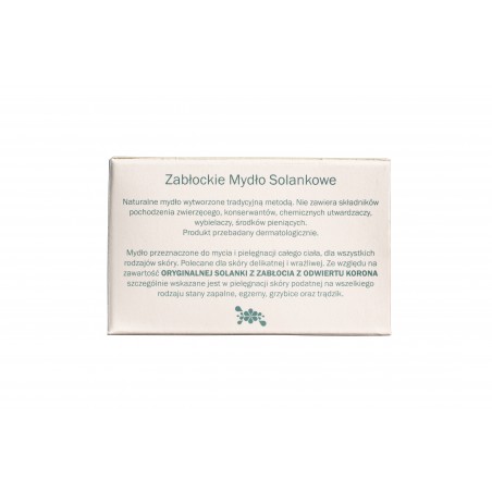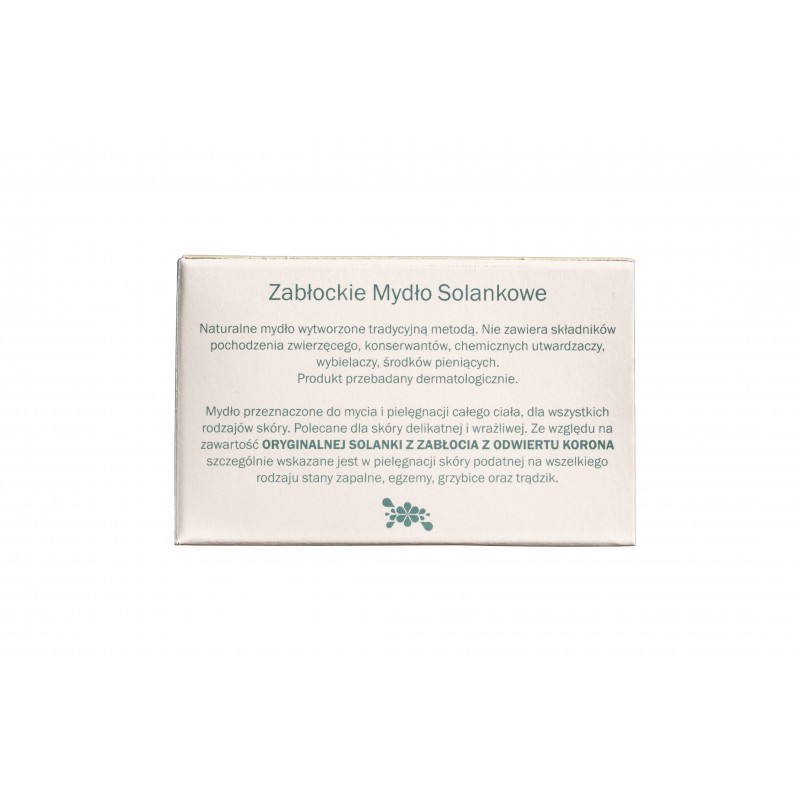 Naturalne mydło przeznaczone do codziennego mycia i pielęgnacji całego ciała. Odpowiednie dla każdego rodzaju skóry, w szczególności dla skóry wrażliwej, delikatnej i problematycznej. Dzięki zawartości Oryginalnej Solanki z Zabłocia z odwiertu „Korona” mydło doskonale sprawdza się w pielęgnacji skóry skłonnej do podrażnień, stanów zapalnych, egzemy, grzybicy oraz trądziku.