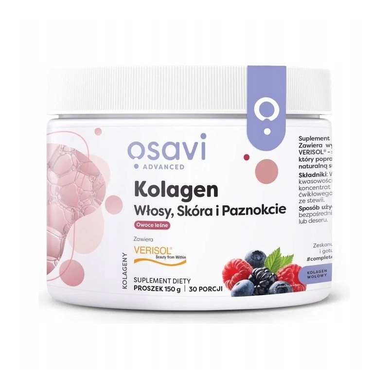Kolagen Wołowy Osavi to suplement diety w formie proszku, zawierający wysoko oczyszczone bioaktywne peptydy kolagenowe VERISOL®. Jest to specjalnie opracowany i przebadany klinicznie kolagen, który pomaga poprawić wygląd włosów, skóry i paznokci.