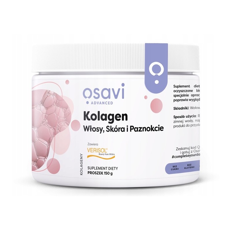 Kolagen Wołowy Osavi to suplement diety w formie proszku, zawierający wysoko oczyszczone bioaktywne peptydy kolagenowe VERISOL®. Jest to specjalnie opracowany i przebadany klinicznie kolagen, który pomaga poprawić wygląd włosów, skóry i paznokci.