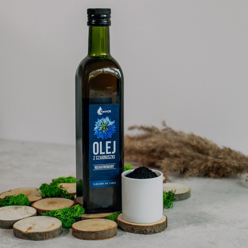 Olej z czarnuszki, tłoczony na zimno, nierafinowany, nieoczyszczony.