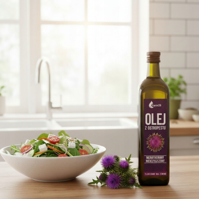 Naturalny, tłoczony na zimno olej z ostropestu plamistego, bogaty w sylimarynę - substancję wspierającą zdrowie wątroby.