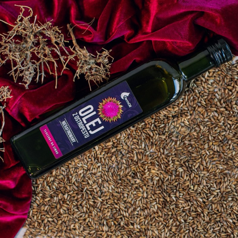 Olej z ostropestu - tłoczony na zimno, nierafinowany poddany jedynie procesowi naturalnej sedymentacji i filtracji. Dzięki temu pozostają w nim wszystkie naturalne składniki. Olej jest naturalny, nie posiada dodatku konserwantów, barwników, antyutleniaczy.