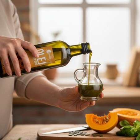 Ten olej z pestek dyni jest idealny do spożycia wyłącznie na zimno – jako dodatek do sałatek, warzyw, pieczywa, deserów. Nie nadaje się do smażenia, ponieważ wysoka temperatura pozbawia go prozdrowotnych właściwości.