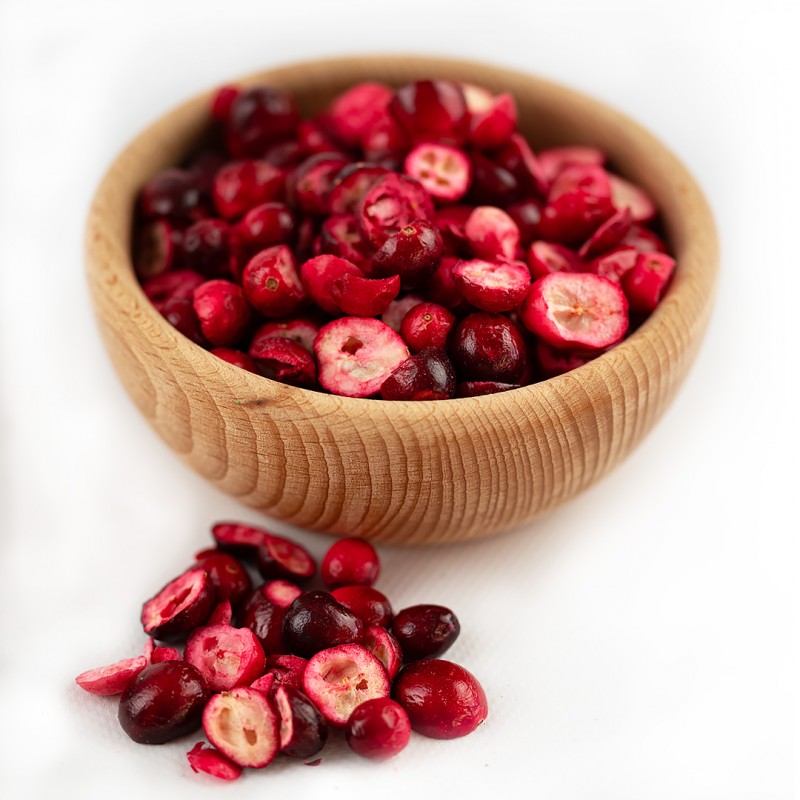 Produkt bez dodatku cukru. Bez konserwantów. Dzięki procesowi liofilizacji owoce żurawiny zachowują pierwotny kształt, kolor, aromat oraz ok 95% wszystkich cennych składników odżywczych.