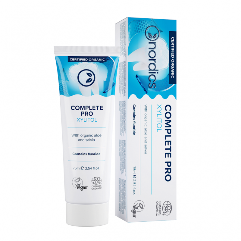 Pasta Nordics Complete Pro z aloesem, szałwią i ekstraktem z granatu łagodzi podrażnienia w jamie ustnej, działa przeciwzapalnie, antyseptycznie i przeciwdrobnoustrojowo. Pomaga redukować płytkę nazębną i wspiera zdrowie dziąseł i zębów.