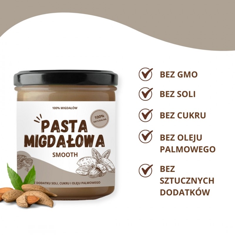 Wysokiej jakości pasta migdałowa wytwarzana w tradycyjny sposób mielenia prażonych migdałów, aż do uzyskania konsystencji masła. Pasta ma kremową konsystencje o naturalnym delikatnym smaku migdałów. Doskonale nadaje się do smarowania kanapek, tostów, jako dodatek do ciast, różnych deserów czy przekąsek.