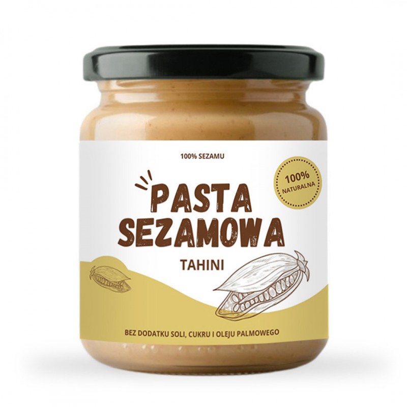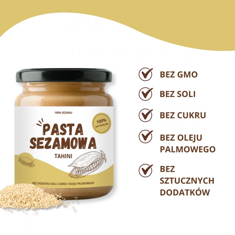 To w pełni naturalny wyrób, który powstaje z łuskanych, delikatnie podprażonych nasion sezamu. Ziarna sezamu są skarbnicą zdrowych tłuszczów i wapnia, dzięki czemu włączenie ich do codziennej diety może zapobiec nowotworom, cholesterolowi i miażdżycy, a także wzmocnić kości. Pastę Tahini często określa się także jako masło sezamowe. Pasta nie zawiera żadnych sztucznych dodatków. Charakteryzuje się intensywnym aromatem i bogatym smakiem.
