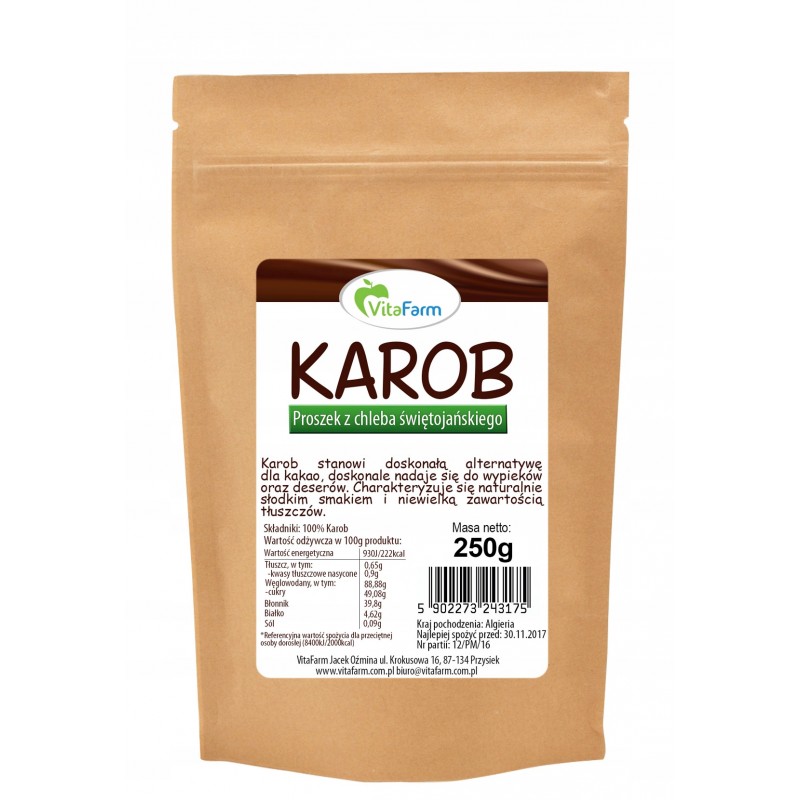 Karob, inaczej mączka chleba świętojańskiego, to doskonały, naturalny substytut kakao. Powstaje w wyniku wysuszenia i zmielenia strączków drzewa karobowego. Jest bogaty w wapń, potas, fosfor oraz magnez, a ponadto nie zawiera kofeiny, co sprawia, że można go podawać także dzieciom. Karob, swój słodki smak zawdzięcza naturalnie występującym cukrom. Jest idealnym dodatkiem do wypieków oraz deserów. Stanowi doskonałą alternatywę dla kakao, doskonale nadaje się do wypieków oraz deserów. Charakteryzuje się naturalnie słodkim smakiem i niewielką zawartością tłuszczów.