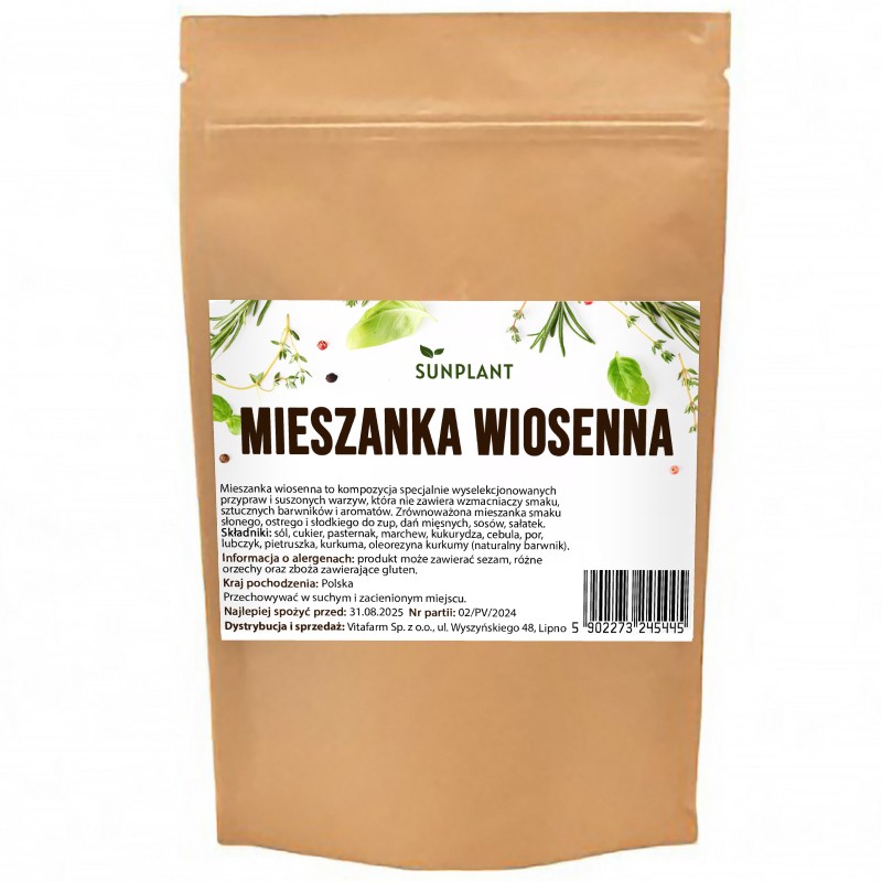 Sprawdź koszty dostawyMieszanka wiosenna to kompozycja specjalnie wyselekcjonowanych przypraw i suszonych warzyw, która nie zawiera wzmacniaczy smaku, sztucznych barwników i aromatów.