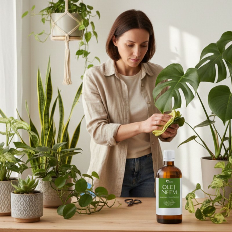 Olej neem to doskonały naturalny środek do utrzymania czystości części nadziemnych rośliny. Regularne przecieranie liści roztworem oleju pozwala skutecznie usunąć kurz, osady wapienne po twardej wodzie oraz inne zanieczyszczenia mechaniczne. Dzięki temu roślina może swobodnie "oddychać" i efektywniej korzystać ze światła słonecznego.