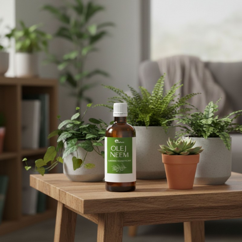 1️⃣ Ochrona roślin w domu - należy wymieszać ok. 5 kropli oleju neem na litr wody z kilkoma kroplami delikatnego mydła i spryskać nim rośliny co kilka dni