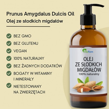 Naturalny olej z pestek migdałów działa zmiękczająco, regenerująco i ochronnie. Doskonale sprawdza się do pielęgnacji skóry suchej, podrażnionej i wrażliwej. Regularne stosowanie nawilża, wygładza i poprawia elastyczność naskórka. Działa przeciwstarzeniowo i wspiera odbudowę naturalnej bariery hydrolipidowej skóry.