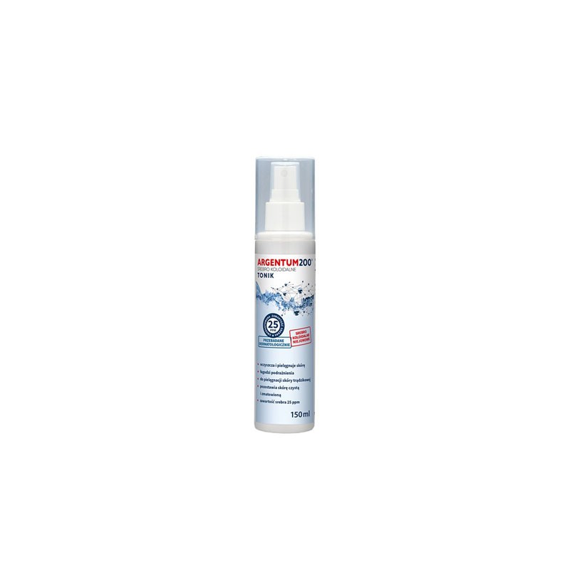Srebro Koloidalne Argentum200® to tonik o wysokiej (25 ppm) zawartości srebra koloidalnego, sporządzony na bazie wody demineralizowanej. Stosowany regularnie oczyszcza, odświeża i pielęgnuje cerę. Przeznaczony do pielęgnacji skóry trądzikowej. Łagodzi podrażnienia. Przebadane dermatologicznie. Badania aplikacyjne srebra koloidalnego Argentum200 potwierdzają, że tonik: