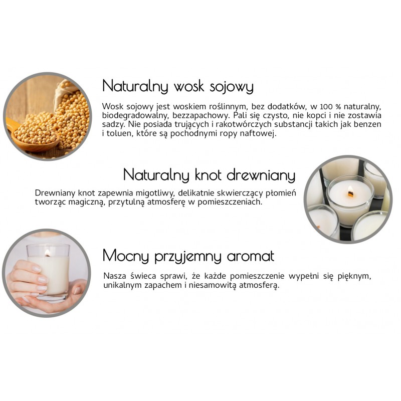Wosk sojowy jest woskiem roślinnym, bez dodatków, w 100 % naturalny, biodegradowalny, bezzapachowy. Pali się czysto, nie kopci i nie zostawia sadzy. Nie posiada trujących i rakotwórczych substancji takich jak benzen i toluen, które są pochodnymi ropy naftowej.