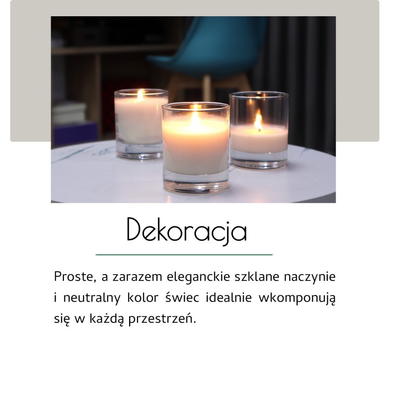 Proste, a zarazem eleganckie szklane naczynie i neutralny kolor świec idealnie wkomponują się w każdą przestrzeń.