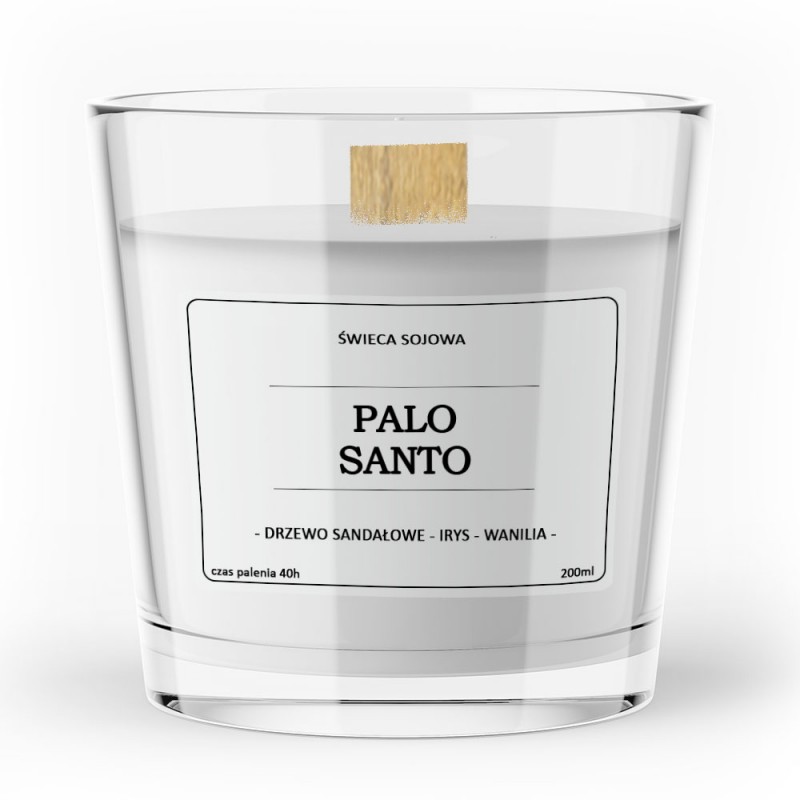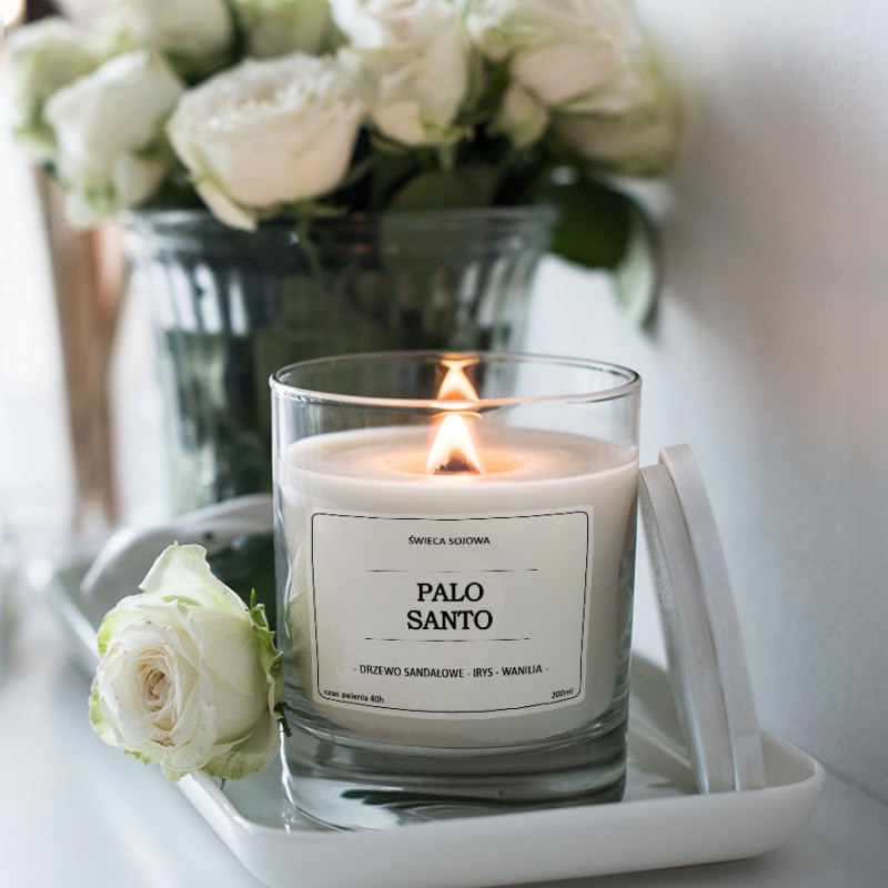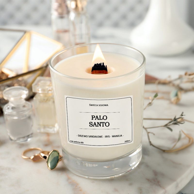 Świeca sojowa Palo Santo z nutami zapachowymi drzewa sandałowego, irysa i wanilii stworzy czarujący i kojący aromat.